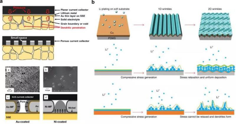 圖10通過a)多孔集流體(Au和Ni)b)軟PDMS襯底來緩解Li枝晶形成的策略,以適應在Li電鍍過程中產(chǎn)生的壓縮應力。