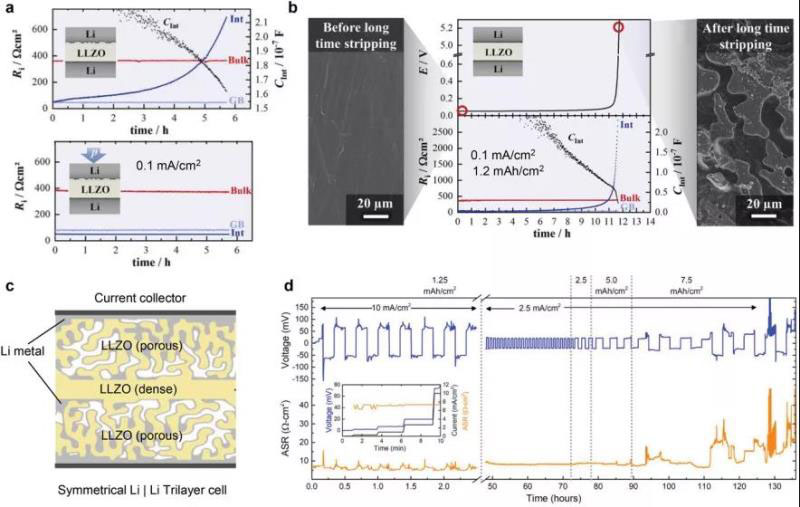 圖9 a)壓力對LLZO基Li|Li對稱電池中界面電阻的影響。在沒有外部施加壓力(上)和垂直于界面的≈35MPa外部施加壓力(下)的情況下,在0.1 mA cm-2下進行長時間鋰剝離實驗的結(jié)果。通過施加外部壓力,可以完全防止導致接觸損失的孔的形成。b)在以0.1 mA cm-2的電流密度剝離12 h(1.2 mAh cm-2)之前和之后,鋰金屬與LLZO電解質(zhì)接觸的微觀結(jié)構(gòu)。c,d)3D固體電解質(zhì)框架作為主體,用于電鍍和隨后剝離Li金屬;具有滲透的鋰金屬負極的三層LLZO電解質(zhì)在兩種不同的電流密度2.5和10 mA cm-2下,顯示電鍍的累積面積容量為7.5 mAh cm-2。