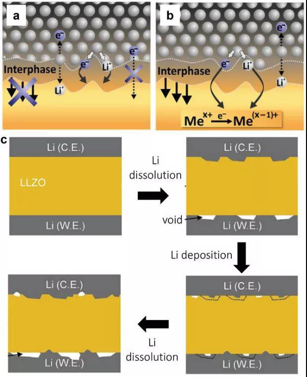 圖8 固體電解質(zhì)與鋰金屬負極之間的固體電解質(zhì)界面相(SEI)的形成機理。a)反應性和亞穩(wěn)的SEI。b)反應性和混合傳導相。c)在重復的Li溶解/沉積循環(huán)過程中Li/LLZO界面的動態(tài)變化的示意圖。