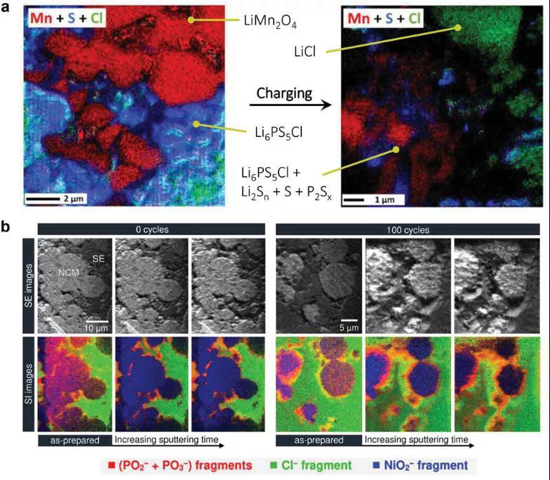 圖6 硫化物基正極復合物中固體電解質(zhì)相的元素map圖。a)在充電之前和之后,從LiMn2O4/Li6PS5Cl/Li-In半電池的復合LiMn2O4電極的截面上對Mn,S和Cl元素進行SAM映射。b)循環(huán)前后在正極的火山口側(cè)壁(NCM622/Li6PS5Cl界面)上進行的ToF‐SIMS測量,表明由于電池循環(huán),POx-和SOx-碎片顯著增加。