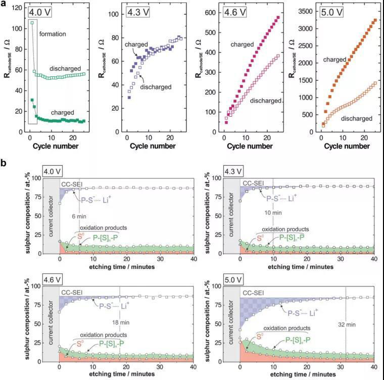 圖5 a)Li-In | b-Li3PS4|NCM-811+b-Li3PS4電池在充電至4.0至5.0 V之間的不同上限電壓時,在正極/硫化物電解質(zhì)界面處的界面電阻的演變。b)在XPS S 2p光譜中,在不同的蝕刻時間和在4.0至5.0 V范圍內(nèi)的不同截止電壓下,對集流體處的正極界面進行定量分析。