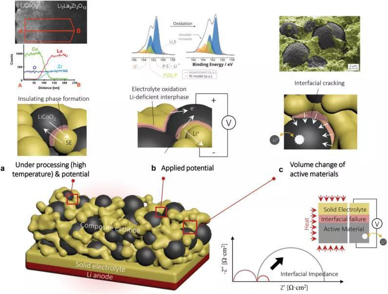 即使在適度的充電/放電速率下,正極側(cè)的界面阻抗仍是整體性能的主要限制因素。硫化物和氧化物(石榴石)型固體電解質(zhì)在接觸形成和電池運行期間面臨嚴重的界面問題。無論固體電解質(zhì)的種類如何,由于在Li嵌入和脫嵌過程中活性物質(zhì)的體積變化,活性物質(zhì)和固體電解質(zhì)之間的界面經(jīng)常分層并且在電池循環(huán)期間遭受接觸損失。
