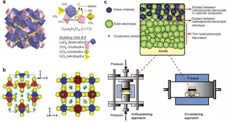 圖4 鋰離子傳輸通道:a) Li7La3Zr2O12和b) Li10GeP2S12。c)加工方法:硫化物(左)和氧化物(右)。