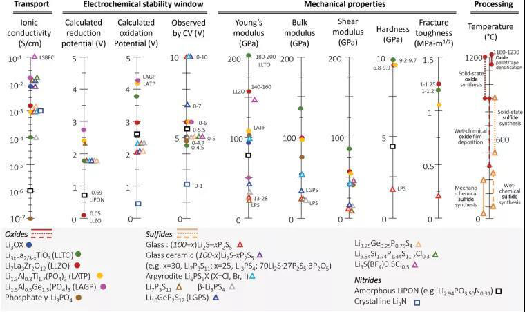 圖3 氧化物和硫化物固體電解質(zhì)的運輸,電化學,機械穩(wěn)定性和加工溫度概述。