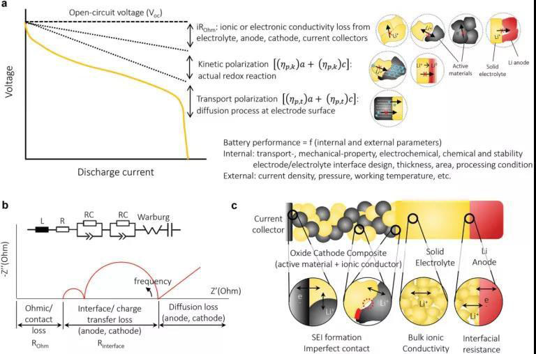 圖2 a)電池的典型放電曲線,顯示了各種極化的影響。電池的總電壓(V)低于施加外加電流后的開路電壓(V oc),這由于多種物理現(xiàn)象而導致電壓下降。b–c)帶有頻率和固態(tài)電池相關組件的經(jīng)典阻抗譜。(c)受SEI形成,不完善的接觸和界面開裂的影響。