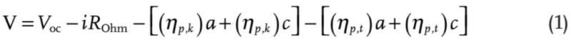 Voc是標準的電池電勢;i是施加的電流; ROhm是電池的歐姆電阻;(ηp,k)a和(ηp,k)c分別是指負極或正極的動力學極化;(ηp,t)a和(ηp,t)c是分別與負極和正極界面處的電荷轉(zhuǎn)移有關的傳輸極化。這些代表了電壓-放電曲線中的非線性影響。