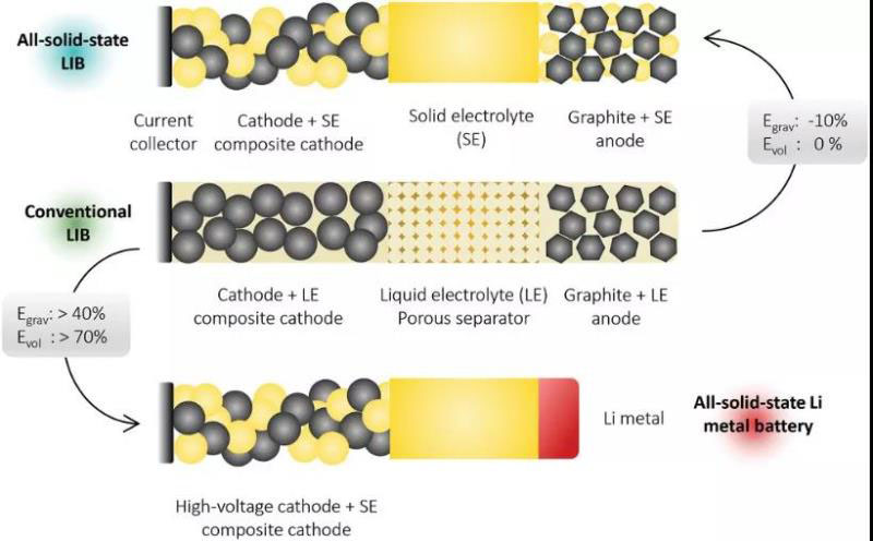 圖1 用固態(tài)電解質(zhì)(全固態(tài)LIB)和鋰金屬負極(全固態(tài)鋰金屬電池)代替?zhèn)鹘y(tǒng)LIB中的液體電解液時,能量密度的變化。體積和重量能量密度分別由Evol和Egrav表示。