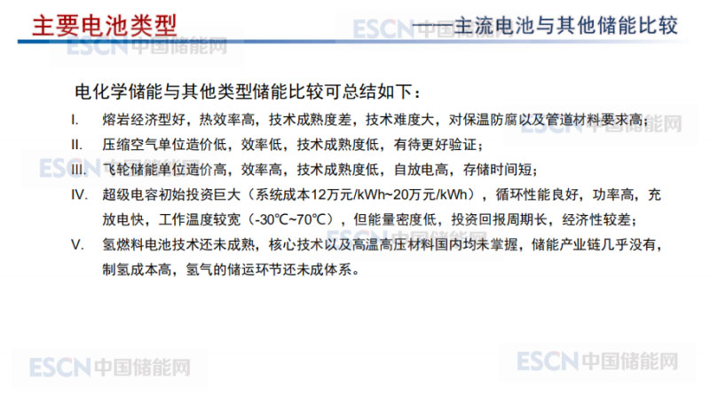 我們主流電池和其他形式儲(chǔ)能相比較,熔巖經(jīng)濟(jì)型比較好,熱效率比較高,技術(shù)成熟度比較差,技術(shù)難度大,對保溫防腐和管道材料要求高;壓縮空氣單價(jià)造價(jià)低,效率低,技術(shù)成熟度低;飛輪儲(chǔ)能造價(jià)高,效率高,但是存儲(chǔ)時(shí)間很短,有可能作為調(diào)頻應(yīng)用?,F(xiàn)在永德后備電源和動(dòng)能回收。超級電容投資非常大,但是循環(huán)性能好,功率高,充放電快,工作溫度廣,但是非常貴,不具有經(jīng)濟(jì)型。氫燃料電池是未來的技術(shù),十幾年后發(fā)展應(yīng)用,現(xiàn)在目前的核心技術(shù)還掌握在日本和德國手中,國內(nèi)的生產(chǎn)鏈條,沒有完整的產(chǎn)業(yè)鏈條,所以對于氫燃料電池還是摸索的階段。
