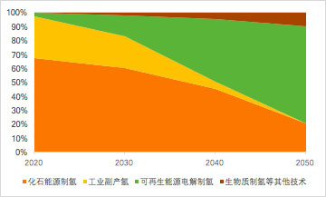 在中國氫能聯(lián)盟發(fā)布的《氫能源及燃料電池白皮書》中,預測隨著我國能源結(jié)構(gòu)由化石能源為主轉(zhuǎn)向以可再生能源為主的格局,氫氣供給結(jié)構(gòu)中可再生能源電解水的比例也將大幅增長,到2050年占比70%。
