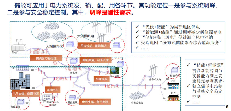二、來看一下儲能在電網(wǎng)當(dāng)中的應(yīng)用,首先在穩(wěn)態(tài)功率平衡當(dāng)中的應(yīng)用,儲能就像保溫瓶,這樣的東西在電網(wǎng)的哪個環(huán)節(jié)不需要?所以可以說在發(fā)、輸、配、用各個環(huán)節(jié)都需要的,調(diào)峰是剛性需要的。光伏+儲能、風(fēng)電+儲能、新能源+儲能都是常見的場景。