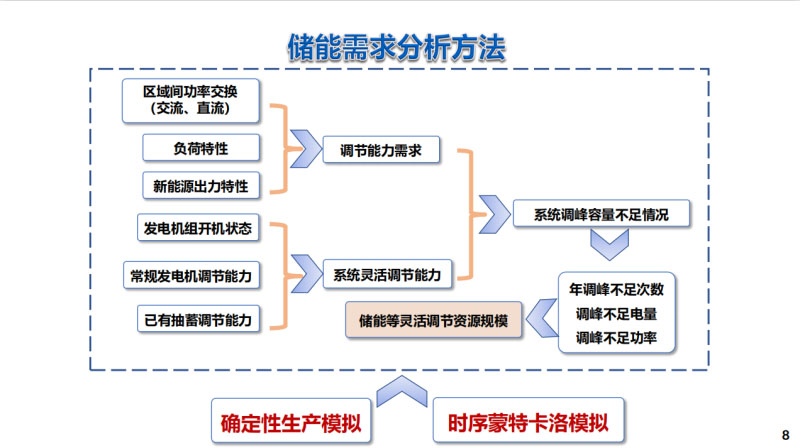 在儲能滿足系統(tǒng)調(diào)峰需求方面,要確定儲能的需求容量和布局,在這方面主要是采用時序生產(chǎn)模擬的方法,一是通過確定性的生產(chǎn)模擬,另外是將隨機(jī)性引入進(jìn)來的模擬,要確定電網(wǎng)對于儲能的需求,可以通過區(qū)域間的功率交換的特性,負(fù)荷特性,新能源出力特性,得到調(diào)節(jié)能力的需求;通過發(fā)電機(jī)組開機(jī)狀態(tài)、常規(guī)發(fā)電機(jī)調(diào)節(jié)能力、已有抽蓄調(diào)節(jié)能力得到系統(tǒng)靈活調(diào)節(jié)能力,最后得到系統(tǒng)調(diào)峰容量不足的情況。