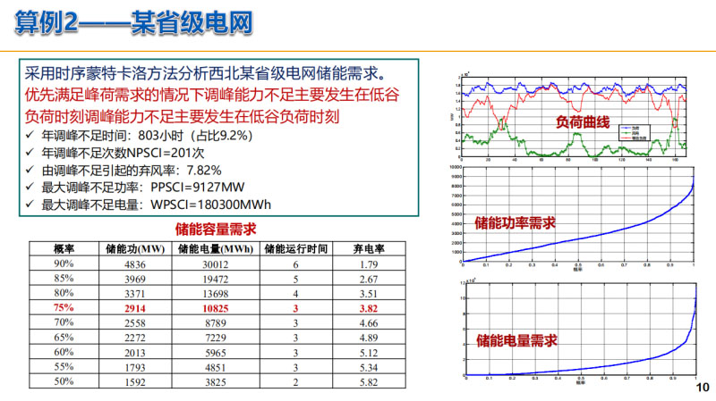 剛才這種方法是基于確定性的方法,把一年的風(fēng)電和光伏的曲線進(jìn)行持續(xù)的模擬,畢竟風(fēng)電和光伏是隨機(jī)性的,所以說可以引入考慮隨機(jī)性的模擬方法,對多年的風(fēng)資源的特性和光資源特性進(jìn)行模擬,這樣得到儲能的配比更具有可行性。這里也是以西北某省級電網(wǎng)做了一個算例,可以得到一年當(dāng)中調(diào)峰不足的時間,次數(shù),產(chǎn)生的棄風(fēng)率是多少,電量是多少。