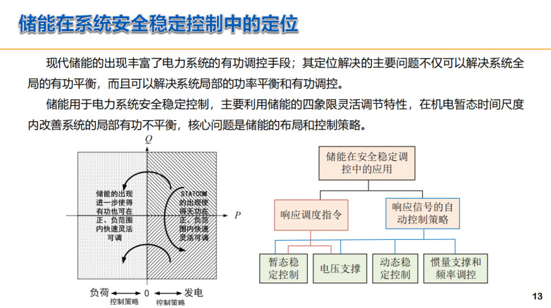 儲能的出現(xiàn)其實是豐富了電力系統(tǒng)的有功調(diào)控手段,不僅可以解決全局的有功平衡,也可以解決局部的功率平衡和有功調(diào)控。我們說儲能具有四象限的靈活調(diào)節(jié)特性,是在有功和無功的坐標(biāo)系下,儲能可以在這四個象限運行,可以充可以放,所以說是非常靈活的調(diào)節(jié)手段,他在電力系統(tǒng)安全穩(wěn)定中的應(yīng)用,大概可以分為兩類,一是響應(yīng)電氣量信號,提高穩(wěn)定性,進(jìn)行電壓支撐等;另外就是響應(yīng)調(diào)度指令,應(yīng)用到電力系統(tǒng)的安控當(dāng)中。