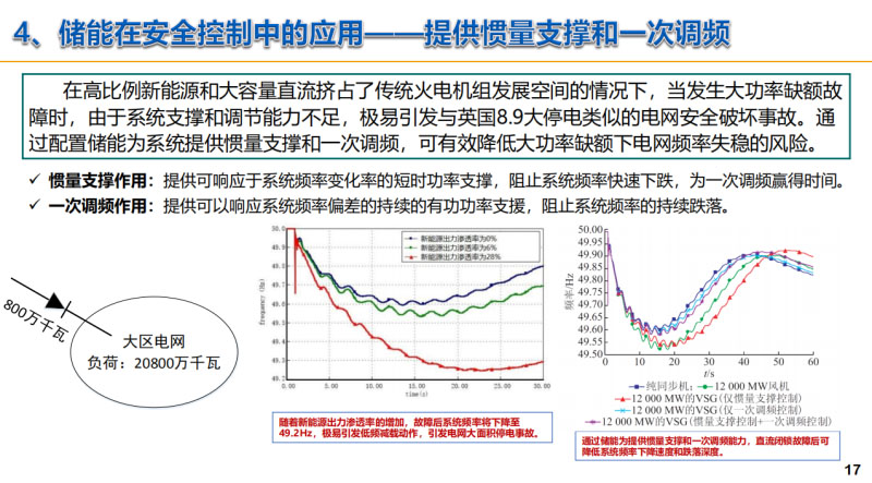 4、提供慣量支撐和一次調(diào)頻,在高比例的新能源和大容量直流擠占了傳統(tǒng)火電機(jī)組發(fā)展空間的情況下,當(dāng)發(fā)生大功率缺額故障的時候,存在引發(fā)系統(tǒng)穩(wěn)定破壞的風(fēng)險,如果配置儲能為系統(tǒng)提供一次調(diào)頻和慣量支撐可以有效降低這種風(fēng)險。儲能在提供慣量支撐主要是提供響應(yīng)于系統(tǒng)頻率變化的短時功率支撐,阻止系統(tǒng)頻率快速下跌,為一次調(diào)頻贏得時間,在一次調(diào)頻方面是響應(yīng)系統(tǒng)頻率偏差,阻止系統(tǒng)頻率的持續(xù)跌落。以一個大區(qū)電網(wǎng)為例,如果特高壓直流、雙級故障損失800萬千瓦,大區(qū)電網(wǎng)中新能源出力滲透率增加到28%時,故障后系統(tǒng)頻率將下降到49.2赫茲,容易引發(fā)低頻減載的動作,引發(fā)電網(wǎng)大面積停電。如果利用儲能提供慣量和一次調(diào)頻,能夠相當(dāng)于把新能源替換成常規(guī)同步機(jī)的效果,可以減少頻率的跌落。