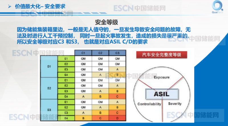這是基本的所謂安全等級示意圖,三個維度來定義的,暴露度、嚴(yán)重度、可控度,映射到儲能系統(tǒng)里面是無人值守的,一旦發(fā)生導(dǎo)致安全問題的故障,人是沒有辦法直接干預(yù),控制度比較小,同時一旦起火之后損失是非常嚴(yán)重的,所以按照表格來講,至少要對應(yīng)C3和S3,也就是對應(yīng)ASILC/D。