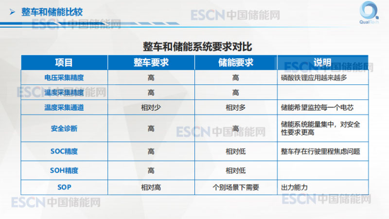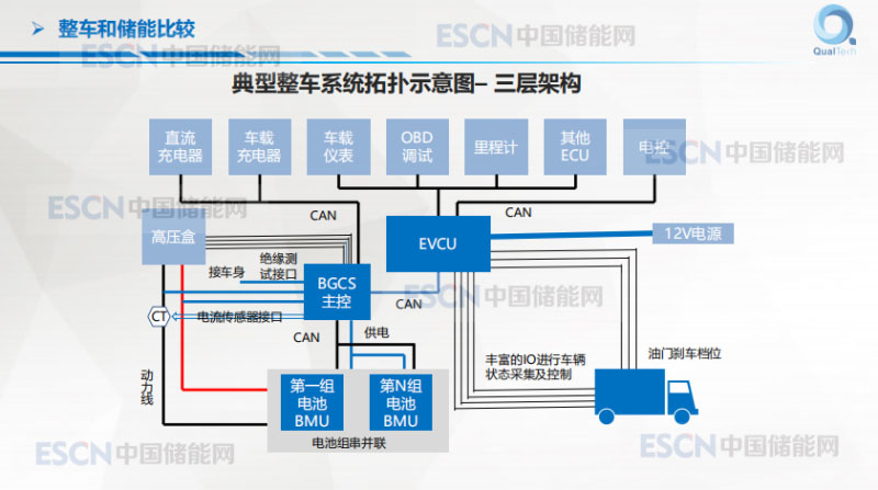 簡單的比較整車和儲能,我們公司也做整車,所以這個方面對車和儲能這兩個有共同點和差異點簡單的對比,車上三層架構(gòu),典型的車的電子架構(gòu)示意圖,這是儲能典型的示意圖。根據(jù)對這兩個系統(tǒng)的理解對比可以簡單來看,對于要求,大部分都是重疊的,只是說有一些個別的地方,比如說儲能里面他的溫度點的采集要多一點,同時他的串?dāng)?shù)大一點,儲能里面也有好處,抗振動要求沒有,工作環(huán)境的溫度相對可控,不像汽車上面-40度到105度,工況比較復(fù)雜,儲能上規(guī)則還是比較確定的,是特定規(guī)則的。儲能上的標(biāo)準(zhǔn)化是比較好做的,汽車上不同的車型標(biāo)準(zhǔn)化很難做。