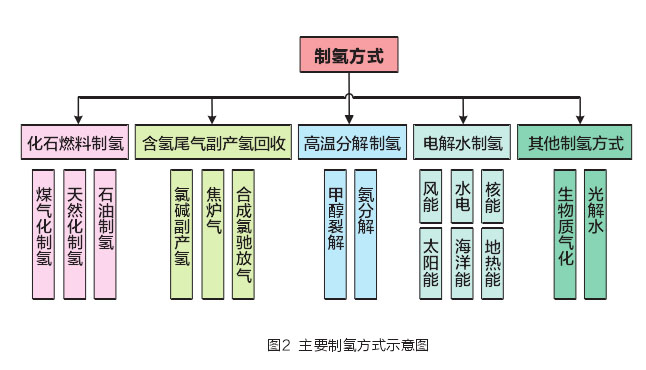 氫作為二次能源,每年氫氣產(chǎn)量約2500萬噸,占全球總產(chǎn)量40%以上,年產(chǎn)值超過1200億元??傮w上,國際上制氫的方式有很多種(見圖2),我國超過95%的氫氣生產(chǎn)主要依靠化石資源,化石資源制氫工藝成熟,原料價格相對低廉,其中煤制氫是當前最為經(jīng)濟的制氫途經(jīng),但會排放大量的溫室氣體,對環(huán)境造成污染,而電解水制氫僅占比2%~4%。