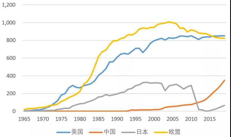 1965-2019年世界部分國家和地區(qū)核電發(fā)電量(單位:太瓦時)