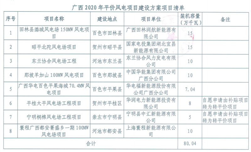 中國儲(chǔ)能網(wǎng)訊:11月27日,廣西壯族自治區(qū)能源局發(fā)布《關(guān)于印發(fā)2020年平價(jià)風(fēng)電和第一批平價(jià)光伏項(xiàng)目建設(shè)方案》的通知。通知顯示,根據(jù)《國家能源局關(guān)于2020年風(fēng)電、光伏發(fā)電項(xiàng)目建設(shè)有關(guān)事項(xiàng)的通知》廣西壯族自治區(qū)能源局統(tǒng)籌制定了2020年平價(jià)風(fēng)電和第一批平價(jià)光伏項(xiàng)目建設(shè)方案,其中列入2020年第一批平價(jià)光伏項(xiàng)目建設(shè)方案項(xiàng)目共3個(gè),裝機(jī)容量26萬千瓦,列入2020年平價(jià)風(fēng)電項(xiàng)目建設(shè)方案項(xiàng)目共8個(gè),裝機(jī)容量約80萬千瓦。