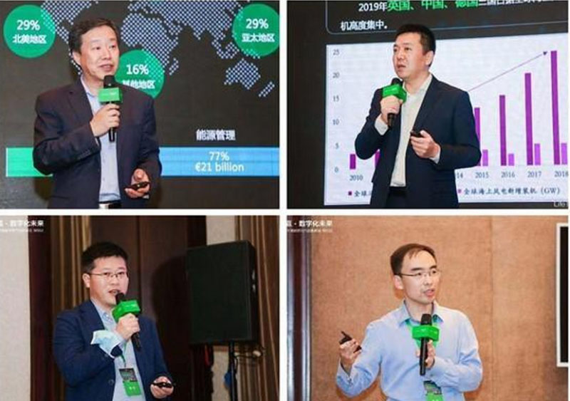 嘉賓演講 (左上:施耐德電氣中國區(qū)副總裁李繼敏,左下:中國化學(xué)與物理電源行業(yè)協(xié)會儲能應(yīng)用分會秘書長劉勇,右上:施耐德電氣能效管理低壓業(yè)務(wù),行業(yè)市場及應(yīng)用部門負責(zé)人趙天意,右下:北京鑒衡認證中心風(fēng)能事業(yè)部總經(jīng)理張宇)