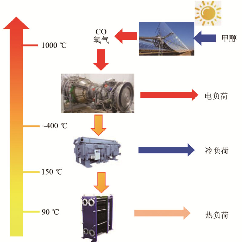 熱化學(xué)蓄熱技術(shù)的耦合應(yīng)用還處于實驗室研究初期,特別是與傳統(tǒng)分布式能源系統(tǒng)耦合應(yīng)用研究較少。Zhang等提出一種熱化學(xué)儲熱技術(shù)與分布式能源系統(tǒng)耦合方式,如圖13所示,甲醇經(jīng)過槽式太陽能集熱器吸收太陽能,通過分解反應(yīng)生成CO和氫氣,之后利用原動機供應(yīng)冷熱電。試驗結(jié)果表明,該系統(tǒng)全年能源平均利用率為47.61%。
