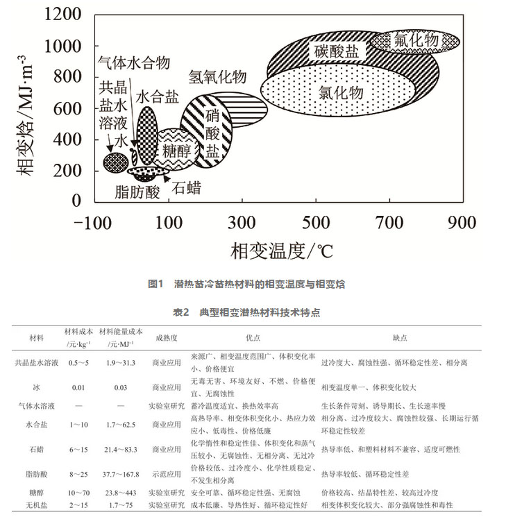 典型的相變潛熱材料主要有共晶鹽水溶液、冰、氣體水溶液、石蠟、脂肪酸、糖醇、水合鹽、無機鹽等,相關(guān)的技術(shù)特點見圖1和表2。從圖中可以看出,可應(yīng)用于蓄冷的潛熱材料主要有共晶鹽水溶液、冰、氣體水合物、水合鹽、石蠟、脂肪酸等材料。其中,共晶鹽水溶液、冰、水合鹽、石蠟等來料已實現(xiàn)商業(yè)應(yīng)用,但是共晶鹽水溶液和水合鹽有較強的腐蝕性??蓱?yīng)用于蓄熱的潛熱材料主要為水合鹽、石蠟、脂肪酸、糖醇、硝酸鹽等無機鹽材料,其中水合鹽和石蠟已經(jīng)實現(xiàn)商業(yè)應(yīng)用,脂肪酸處于示范應(yīng)用階段,但是,其成本較石蠟更高,循環(huán)穩(wěn)定性不能滿足實際應(yīng)用要求限制了其應(yīng)用。
