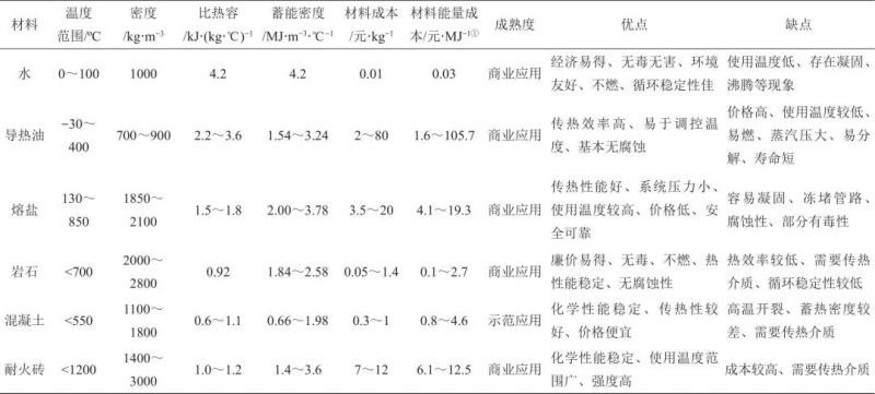 顯熱蓄冷蓄熱材料是在相態(tài)不改變情況下,利用自身比熱容和溫度升降實現(xiàn)熱量和冷量的蓄積或釋放。典型顯熱材料主要有液體和固體兩種狀態(tài)。液態(tài)材料主要有水、導(dǎo)熱油、熔鹽等,固態(tài)材料主要有巖石、混凝土、陶瓷、耐火磚等,相關(guān)技術(shù)特點見表1。