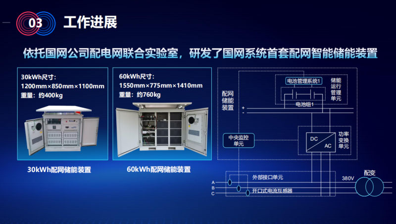對配網(wǎng)側(cè)的裝置做了研究研發(fā)和應(yīng)用。 依托國網(wǎng)公司配電網(wǎng)聯(lián)合實驗室,研發(fā)了國網(wǎng)系統(tǒng)首套配網(wǎng)智能儲能裝置:30kWh和60kWh兩套裝置,裝置本身具有三大技術(shù)特點,或者是設(shè)計的三大原則。