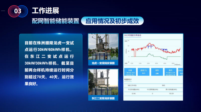 目前做了30千瓦時和60千瓦時兩臺樣機,在現(xiàn)場進(jìn)行試點應(yīng)用,其中株洲醴陵龍虎一變臺區(qū)也是有針對性的,負(fù)荷很重,在過夏的時候過載率也達(dá)到了130%,峰值到了150%,把這裝置裝上去之后,從圖上可以看出受到了很好的削峰填谷的效果,在裝置裝上去之后,7月份裝的,配電和臺區(qū)供電得到了很好的保障,沒有因為重過載而導(dǎo)致的燒損和其他供電鼓掌。
