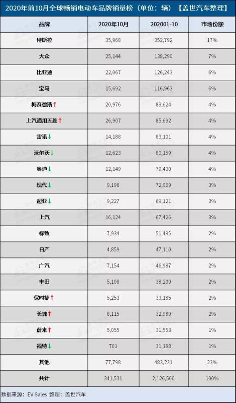 就前十個(gè)月累計(jì)銷量來(lái)說(shuō),特斯拉仍遙遙領(lǐng)先,領(lǐng)先其他品牌二十余萬(wàn)輛;大眾和比亞迪分列第二和第三,不過(guò)兩者之間僅有1萬(wàn)余輛的差距,到年底名次是否會(huì)互換還尚不可知;上汽通用五菱進(jìn)步明顯,攀升5名來(lái)到第6名,與當(dāng)前第5名梅賽德斯之間僅有不到4,000輛的差距,預(yù)計(jì)到年底上汽通用五菱的名次將繼續(xù)攀升。