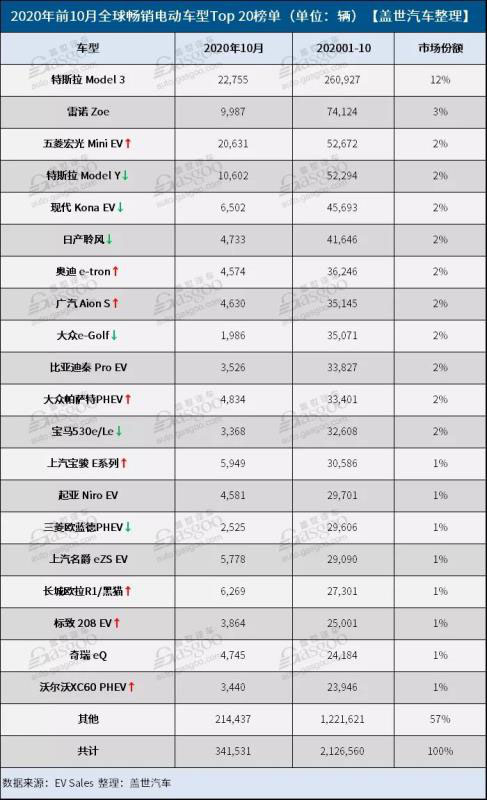 就前十月累計(jì)銷量來(lái)說(shuō),五菱宏光Mini EV的排名進(jìn)步神速,憑借52,672 輛的累計(jì)銷量攀升4名躋身前三名。當(dāng)前,該款車產(chǎn)量還在急劇上升,預(yù)計(jì)其強(qiáng)勁攻勢(shì)仍將持續(xù),到年底將足以超越第二名雷諾Zoe。特斯拉Model 3前十月累計(jì)銷量超26萬(wàn)輛,領(lǐng)先雷諾Zoe和五菱宏光Mini EV 20萬(wàn)輛,因此預(yù)計(jì)仍將蟬聯(lián)2020年全球電動(dòng)車銷冠。