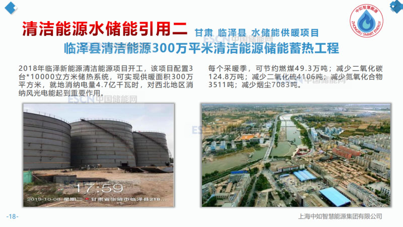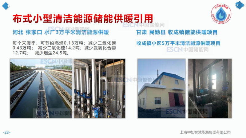 前面講那么多的電場,那么多的儲能,水蓄能還有電場的調(diào)峰,把這部分的電怎么辦電能轉(zhuǎn)換為熱能,增加供暖面積,所以就放了兩個(gè),一個(gè)是陜西的發(fā)電調(diào)峰項(xiàng)目,遼寧盤錦40兆瓦10臺增加一千萬的供暖面積。給大家一個(gè)概念,除了儲電還可以儲水,我們水供暖是從1950年開始。這是甘肅做的小型的,是鄉(xiāng)鎮(zhèn),鄉(xiāng)鎮(zhèn)5萬平米,改成了我們清潔能源加上太陽能,形成了功能互補(bǔ)。這以前是燃煤的,現(xiàn)在改了我們的。