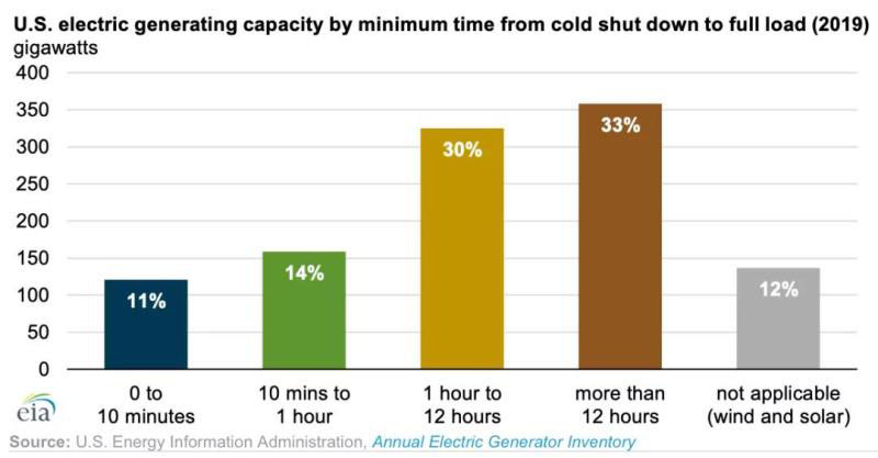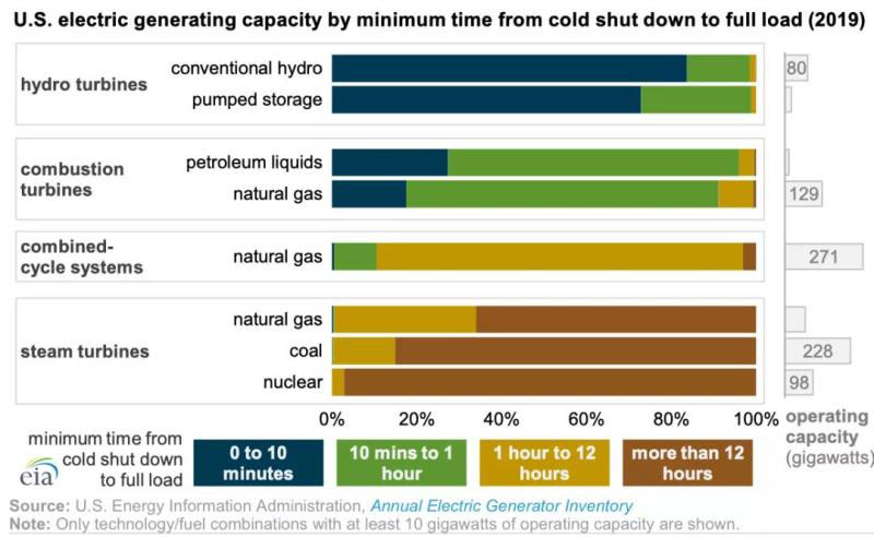 大多數(shù)水力渦輪機(jī)使用流動(dòng)的水來(lái)旋轉(zhuǎn)渦輪機(jī),從冷啟動(dòng)到完全運(yùn)行不到10分鐘(占美國(guó)電力裝機(jī)的11%)。燃燒式渦輪機(jī),使用燃燒的燃料空氣混合物來(lái)旋轉(zhuǎn)渦輪機(jī),啟動(dòng)速度也相對(duì)較快(1小時(shí)之內(nèi),占美國(guó)電力裝機(jī)14%)。蒸汽輪機(jī)通常需要更多的時(shí)間,因?yàn)槿剂霞訜崴纬烧羝?,蒸汽需要達(dá)到一定的溫度、壓力和含水量閾值,然后才能被引導(dǎo)到渦輪機(jī)上,從而使發(fā)電機(jī)旋轉(zhuǎn)。