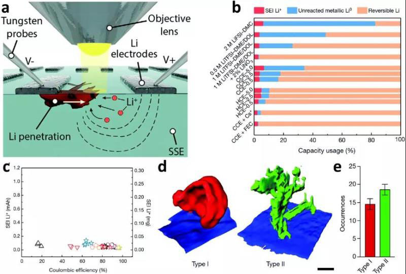 圖18 (a)面內(nèi)電池幾何結(jié)構(gòu)和實(shí)驗(yàn)裝置的示意圖;(b)鋰電池總?cè)萘康姆謹(jǐn)?shù);(c)庫(kù)侖效率和電解質(zhì)中形成SEI所消耗的Li+之間缺乏相關(guān)性;(d)兩種枝晶結(jié)構(gòu)的三維重建;(e)兩種類型的樹突數(shù)量大致相等。