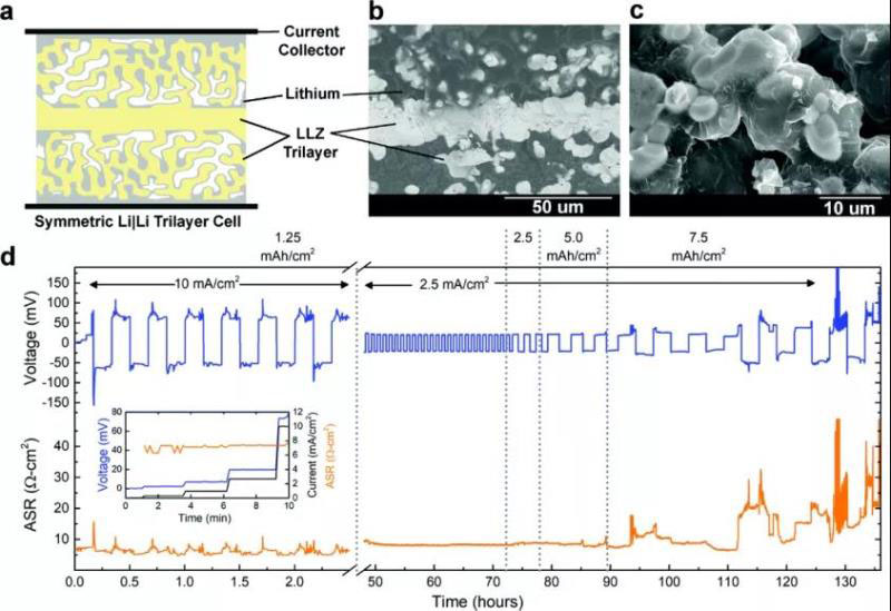 圖17 (a)三層鋰對(duì)稱電池示意圖;(b)三層石榴石的背散射電子圖像;(c)SEM圖片;(d)恒電流循環(huán)期間,電池電壓響應(yīng)(藍(lán)色)和特定區(qū)域電阻(橙色)。