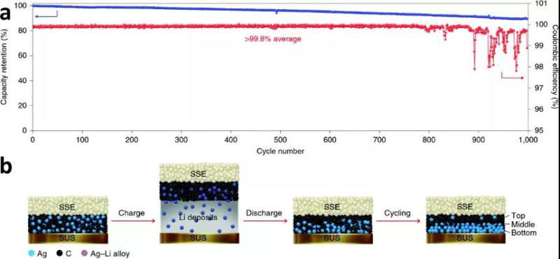 圖15 (a)一個(gè)NMC/Li6PS5Cl/Ag–C電池的循環(huán)壽命和庫(kù)侖效率;(b)充放電過程中,Ag-C納米復(fù)合材料層下,集流體上的鋰電鍍/剝離示意圖。