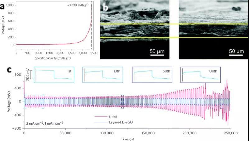 圖12 (a)鋰-還原氧化石墨烯電極的電勢(shì)曲線;(b)鋰-還原氧化石墨烯電極厚度的原位掃描電鏡表征;(c)循環(huán)性能。