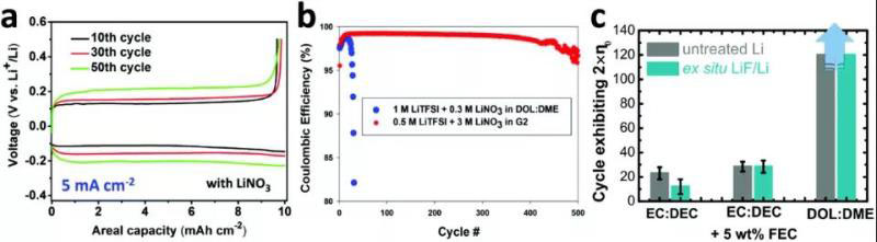 鋰金屬電極的另一個(gè)關(guān)鍵指標(biāo)是庫(kù)侖效率,它本質(zhì)上是電極循環(huán)穩(wěn)定性的一種度量,可用于預(yù)測(cè)電池的循環(huán)壽命。即使消除了由于溶解的多硫化鋰導(dǎo)致的正、負(fù)電極之間的電子穿梭,也必須提高鋰金屬的循環(huán)壽命,以獲得更接近實(shí)際可充電電池的預(yù)期的循環(huán)壽命。