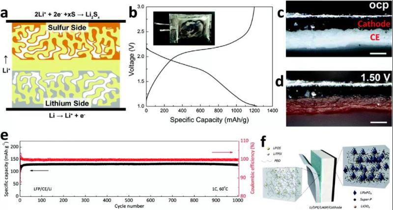 圖9 (a)用Li6.75La2.75Ca0.25Zr1.5Nb0.5O12固體電解質(zhì)制成的鋰硫電池示意圖;(b)電池的充電和放電曲線;(c-d)硫正極/復(fù)合電解質(zhì)/鋰電池的原位截面光學(xué)顯微鏡圖像;(e)循環(huán)壽命;(f)循環(huán)后電池示意圖。