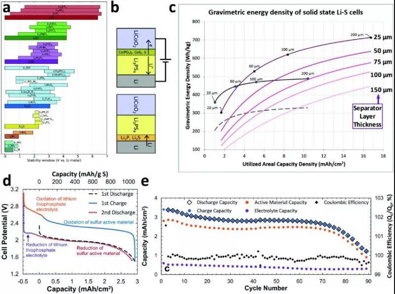 圖8 (a)各種固體電解質(zhì)材料的電化學(xué)穩(wěn)定性范圍;(b)Li3P4固體電解質(zhì)和LiCoO2(頂部)或鋰金屬(底部)之間形成的SEIs;(c)固態(tài)鋰硫電池的重量能量密度模型;(d)充放電曲線;(e)全電池容量和庫(kù)倫效率。