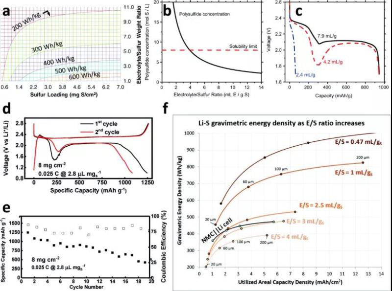 硫電極通常含有大量的碳以賦予導(dǎo)電性,電解質(zhì)賦予離子導(dǎo)電性。不幸的是,這些材料增加了硫電極的重量和體積,而它們本身沒有存儲(chǔ)任何電荷。因此,如果沒有高硫負(fù)載和低電解質(zhì)/硫比,高能量鋰硫電池的前景將無法實(shí)現(xiàn)。以前,我們將重量能量密度建模為具有75wt%硫正極、75%利用率和2.15V平均放電電位的函數(shù)。圖5a所示的結(jié)果表明,電解質(zhì)/硫的重量比<4可實(shí)現(xiàn)超過400 Wh kg-1和<3達(dá)到500 Wh·kg-1。類似地,硫含量至少在3 mg cm-2以上。不幸的是,在保持高利用率和長(zhǎng)循環(huán)壽命的同時(shí),很難實(shí)現(xiàn)這兩個(gè)特征。