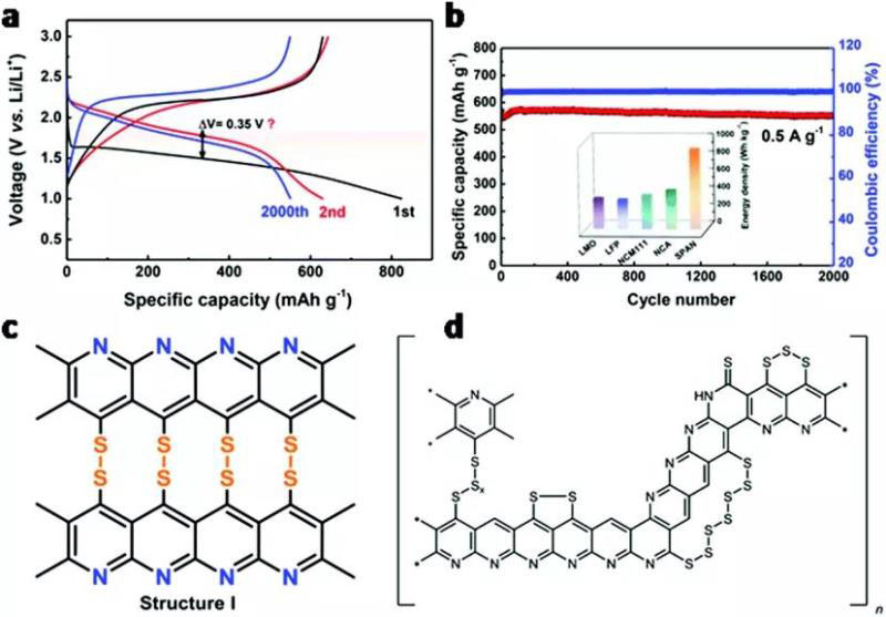 圖4 (a)恒流充放電曲線;(b)循環(huán)性能和庫(kù)倫效率;(c)提出了重復(fù)的電化學(xué)活性單位SPAN。(d)SPAN中提出的結(jié)構(gòu)基元,可能具有電化學(xué)活性。