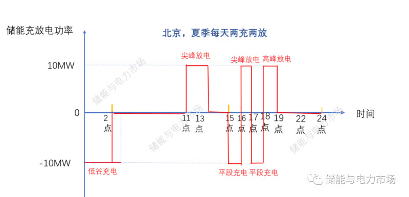 夏季,每天低谷0-2點(diǎn),平段15-16點(diǎn),17-18點(diǎn)充電,總共充電4小時(shí),每天高峰18-19點(diǎn),以及尖峰11-13點(diǎn)、16-17點(diǎn)放電,總計(jì)放電4小時(shí)。