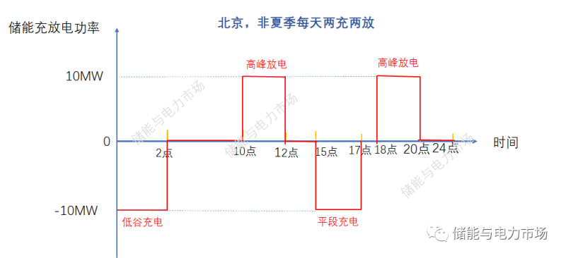 非夏季,每天低谷0-2點(diǎn),平段15-17點(diǎn)各充電2小時(shí),總計(jì)充電4小時(shí)。每天高峰10-13點(diǎn),18-20點(diǎn)各放電2小時(shí),總計(jì)放電4小時(shí)。