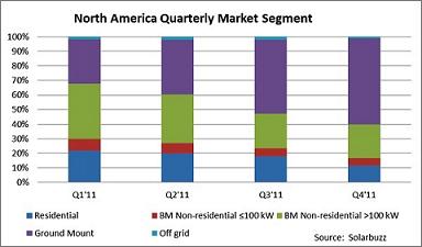2011年各季北美太陽能光伏市場不同安裝類別占據(jù)比例