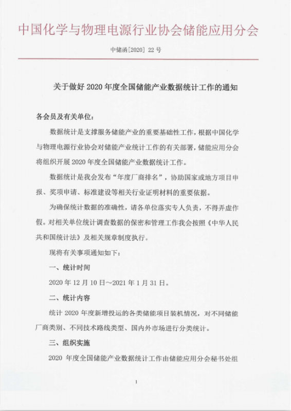 關(guān)于做好2020年度全國儲(chǔ)能產(chǎn)業(yè)數(shù)據(jù)統(tǒng)計(jì)工作的通知