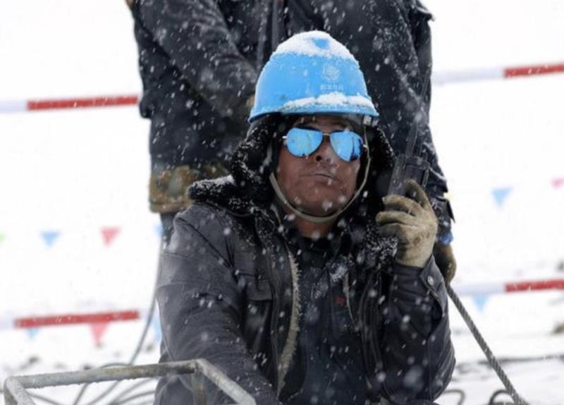 “施工人員服用保護(hù)心臟的藥,背著氧氣瓶上到山頂,工作時心跳一直保持在每分鐘120次以上,一個小時就得輪班下來?!弊T晉說,山頂?shù)奶鞖庾兓脽o常,有時晴朗,強烈的紫外線照得大家滿臉?biāo)?;有時一場大雪,有的工人會瞬間雪盲。