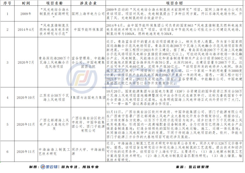 海上風(fēng)電制氫項(xiàng)目情況
