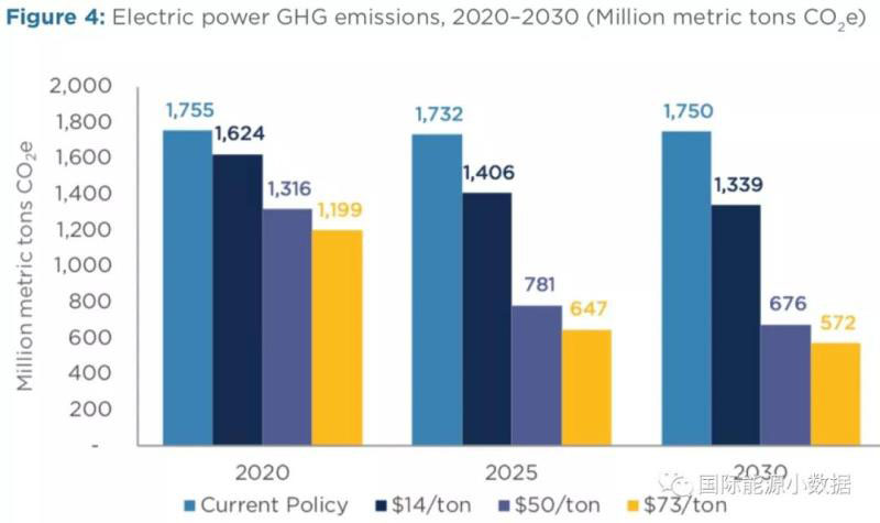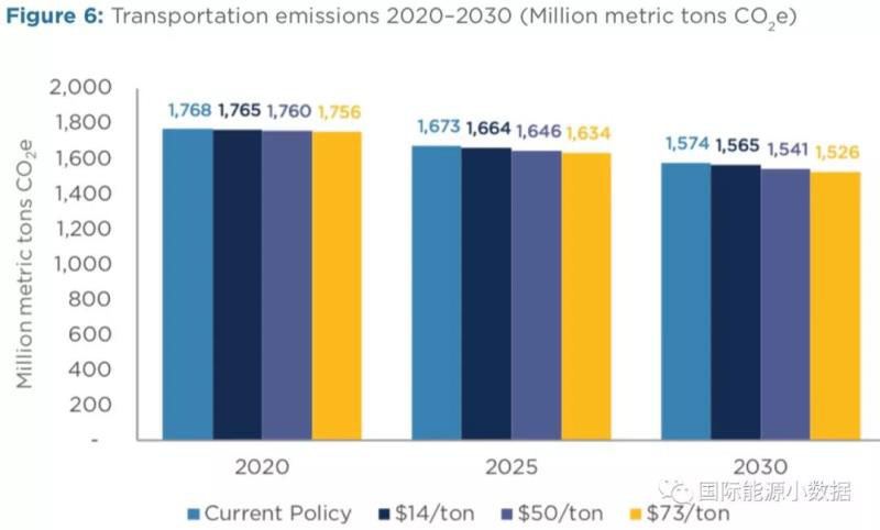 第二,碳稅對電力部門的煤電廠影響最大(煤電廠加速退役),到2030年因為碳稅實現(xiàn)的減排量中80%來自電力部門。如果碳稅為50美元/噸,那么2030年電力部門碳排放為6.76億噸,比沒有碳稅的情境下的排放量降幅達61%。而50美元/噸的碳稅對于交通部門的減排量影響非常小(-2%)。