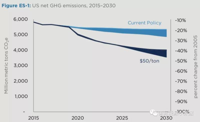 第一,碳稅有助于減排,但是需要達到較高的碳價水平才能充分發(fā)揮作用。如果碳稅達到50美元/噸的時候,美國2025年代碳排放量將比2005年下降39%-46%(美國奧巴馬政府的減排目標是26%-28%)。如果2050年代減排目標是比2005年下降80%,那么屆時碳稅需要超過100美元/噸。